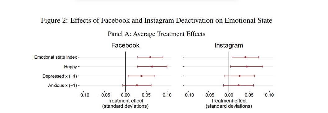 Users who deactivated Facebook for six weeks reported a 0.060 standard deviation improvement in emotional state, an index combining happiness, anxiety and depression. Instagram users who did the same saw a 0.041 standard deviation improvement.