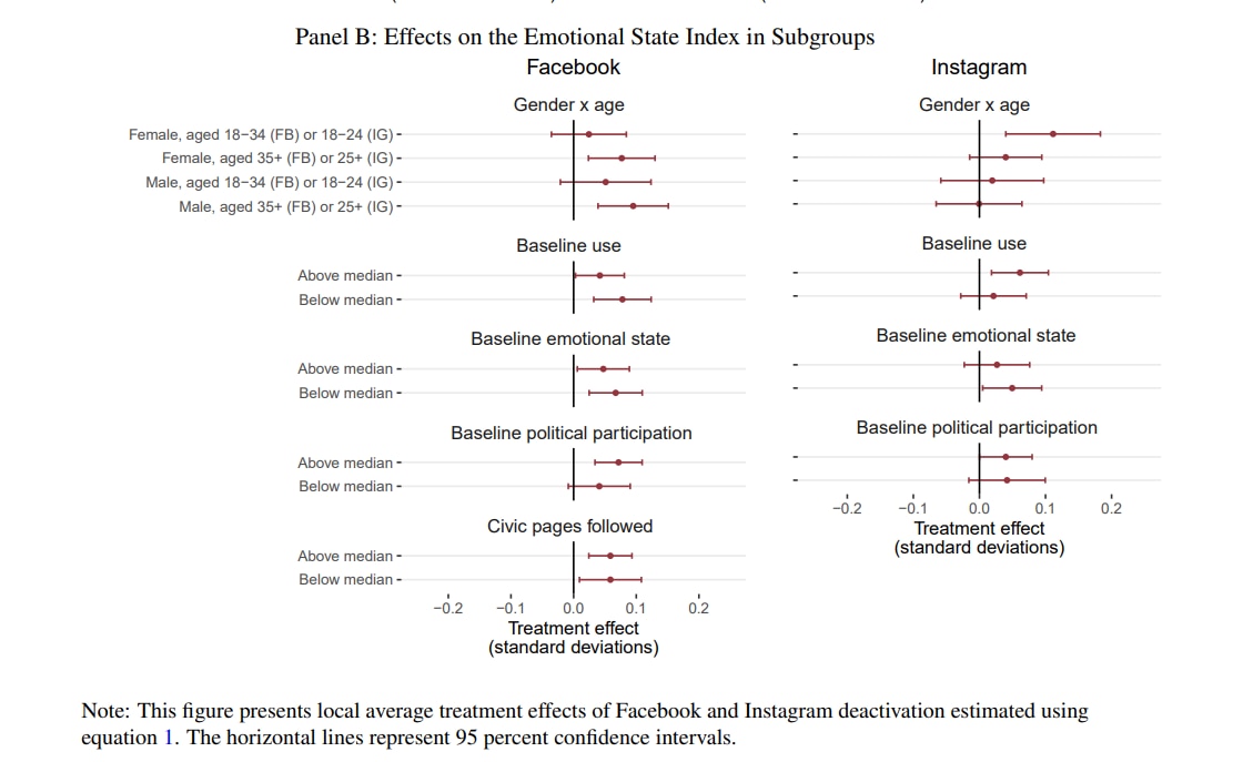The effects vary sharply across groups. Facebook’s impact is more pronounced among older users, while Instagram’s benefits are concentrated among younger women.