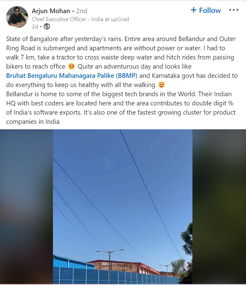 Arjun Mohan, who is CEO of edtech company UpGrad, shared in a Linkedin post that he had to take the help of a tractor to cross waist-deep water and hitch rides from passing bikers to reach his office. He also posted a video of the water-clogged roads of Bengaluru. Sharing the video, Mohan wrote on Linkedin, "State of Bangalore after yesterday's rains. Entire area around Bellandur and are Outer Ring Road is submerged and apartments are without power or water. I had to walk 7 km, take a tractor to cross waist-deep water and hitch rides from passing bikers to reach office. Quite an adventurous day and looks like Bruhat Bengaluru Mahanagara Palike (BBMP) and Karnataka govt has decided to do everything to keep us healthy with all the walking ."