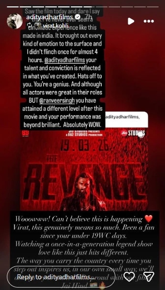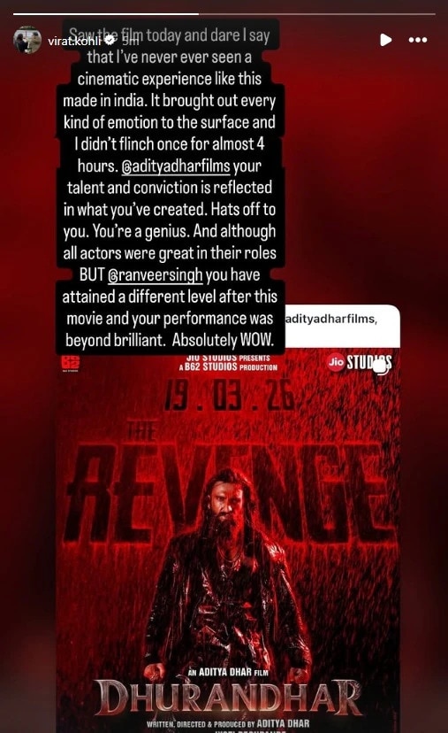Calling Dhurandhar 2 "an emotionally gripping experience," Virat Kohli said that the film held his attention for nearly 4 hours. Kohli said that he "didn't flinch even once".