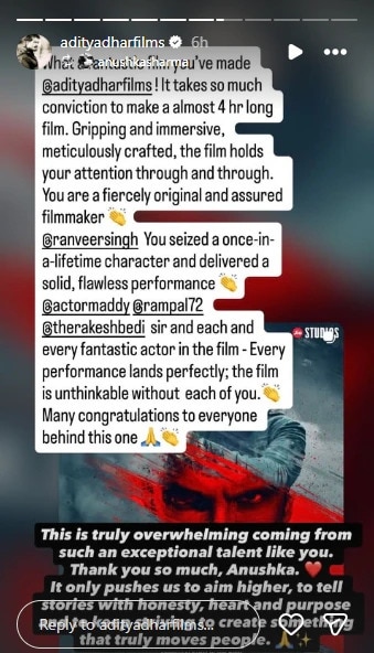 Reacting to the film, Anushka Sharma praised the film's grand scale, immersive storytelling and director Aditya Dhar's conviction in creating a nearly 4-hour narrative. She also backed Ranveer Singh for seizing a "once-in-a-lifetime character" and delivering a "flawless performance.