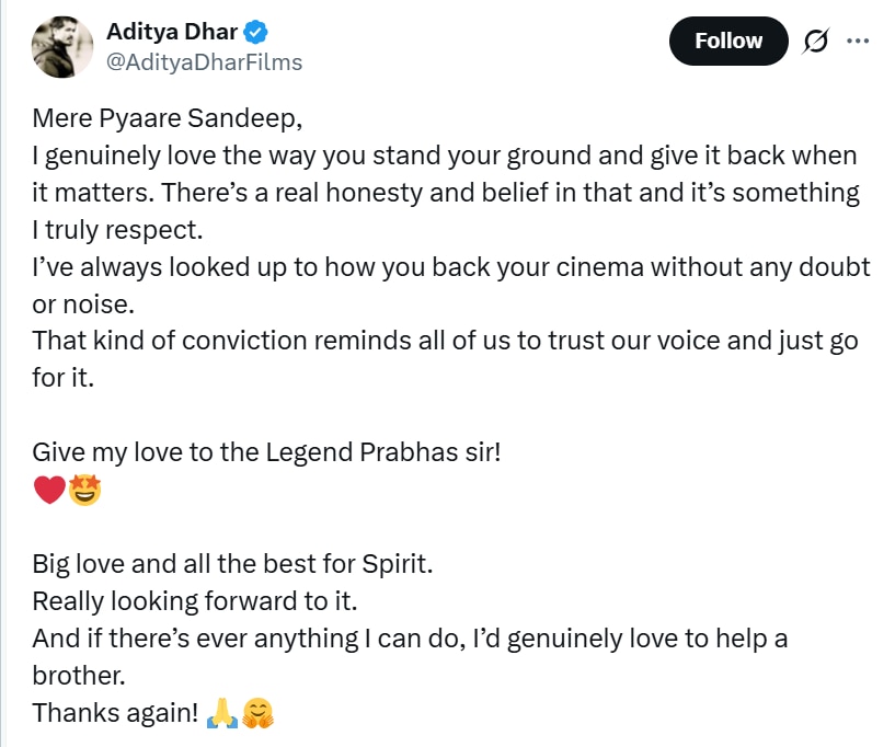 Aditya Dhar replied to Vanga's post and said, "I genuinely love the way you stand your ground and give it back when it matters. There's a real honesty and belief in that, and it's something I truly respect (sic)."