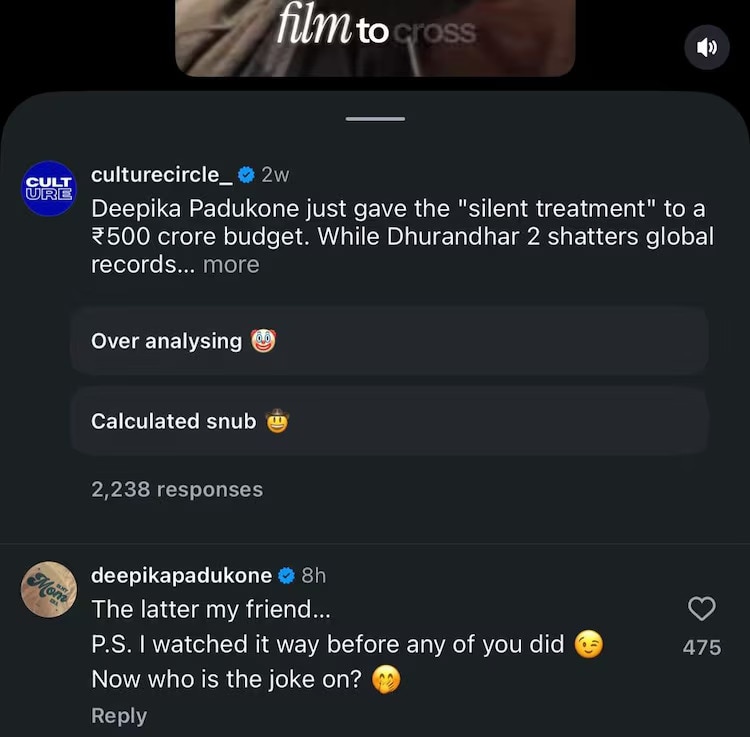 While addressing the chatter around her silence on Dhurandhar 2's resounding success, Deepika responded in the comments section of an Instagram post, saying, “I watched it way before any of you did,” before adding, “Now who is the joke on?”