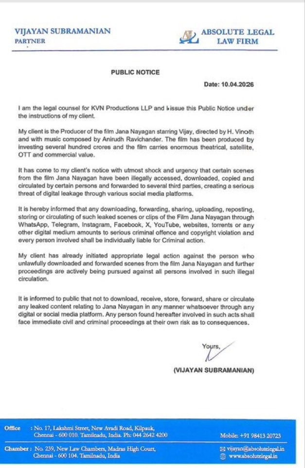 Vijay's Jana Nayagan leak triggers legal actionThe makers of Jana Nayagan have initiated legal action after the film was leaked online ahead of its theatrical release, intensifying the controversy surrounding Thalapathy Vijay's final film. The production house has issued a strong public notice warning that anyone involved in sharing or accessing the leaked content could face criminal proceedings.