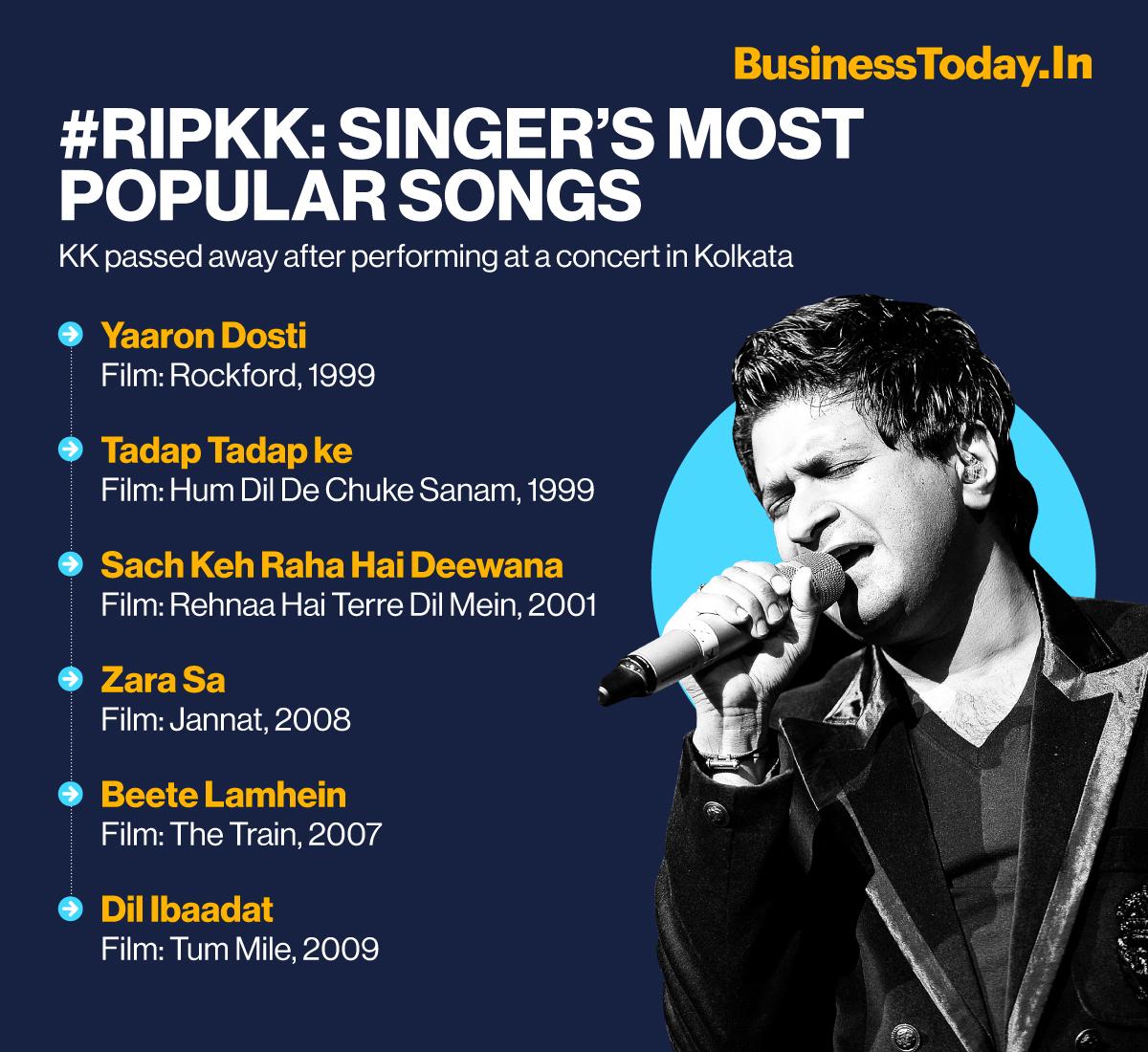 KK was a versatile singer known for his songs in Bengali, Hindi, Kannada, Malayalam, Marathi, Tamil and Telugu among other languagesSinger Krishnakumar Kunnath or KK died on May 31 late night after performing at a concert organised by a college in south Kolkata’s Nazrul Mancha. KK was feeling unwell when he reached his hotel following his performance which lasted for about an hour.