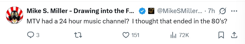 A second user said, "MTV had a 24-hour music channel? I thought that ended in the 80's?"