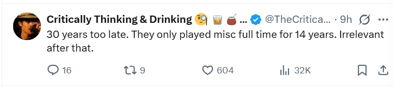 "30 years too late. They only played misc full time for 14 years. Irrelevant after that," another user commented.