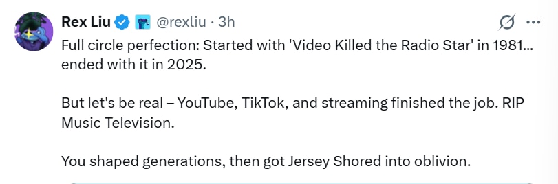 "Full circle perfection: Started with 'Video Killed the Radio Star' in 1981... ended with it in 2025. But let's be real -- YouTube, TikTok, and streaming finished the job. RIP Music Television. You shaped generations, then got Jersey Shored into oblivion," a user said.