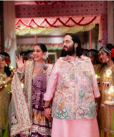 She finished her look with a neat bun that was decorated with flowers. Anant donned a pink kurta set and an embellished jacket. Ambani Jr's outfit was designed by acclaimed fashion designer Rahul Mishra.