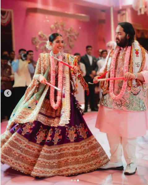 The garba night on July 9 saw an almost color-coordinated Anant and Radhika groove to the tunes of garba. Radhika looked absolutely gorgeous in a purple lehenga choli and dazzled in diamonds.