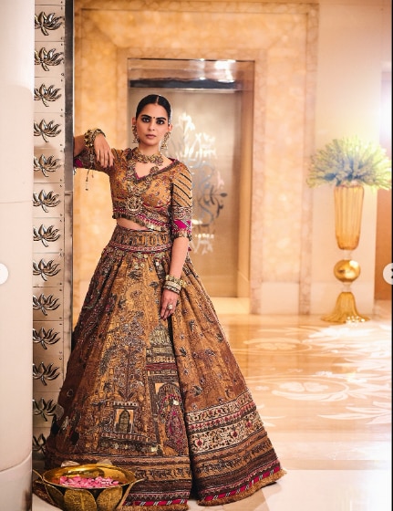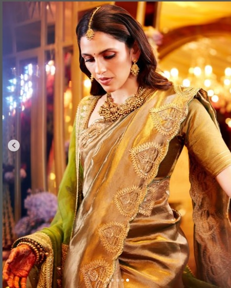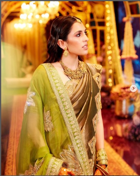 Meanwhile, Shloka Mehta Ambani looked like a million bucks in a green tissue saree designed by Masaba Gupta. She wore the saree for the Shiv Shakti puja held ahead of the wedding festivities. The saree features 'paan-patti' motifs in intricate pita and gota work on the borders.