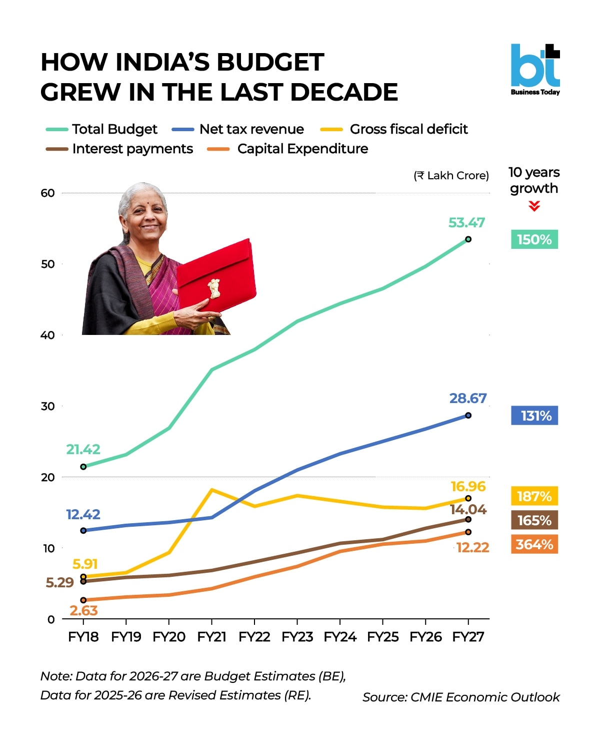 Union Budget 2026: Over the past decade, India’s Union Budget has expanded sharply, reflecting a larger economy, rising public spending needs, and a stronger push towards infrastructureUnion Budget 2026 | Finance Minister Nirmala Sitharaman presented the Union Budget for FY27 in Parliament on February 1. The total expenditure for the year has been pegged at Rs 53.47 lakh crore. Over the past decade, India’s Union Budget has expanded sharply, reflecting a larger economy, rising public spending needs, and a stronger push towards infrastructure. Data from CMIE’s Economic Outlook shows that while total government spending and capital expenditure have grown significantly, interest payments have also risen steadily, underlining the increasing cost of government borrowing.
