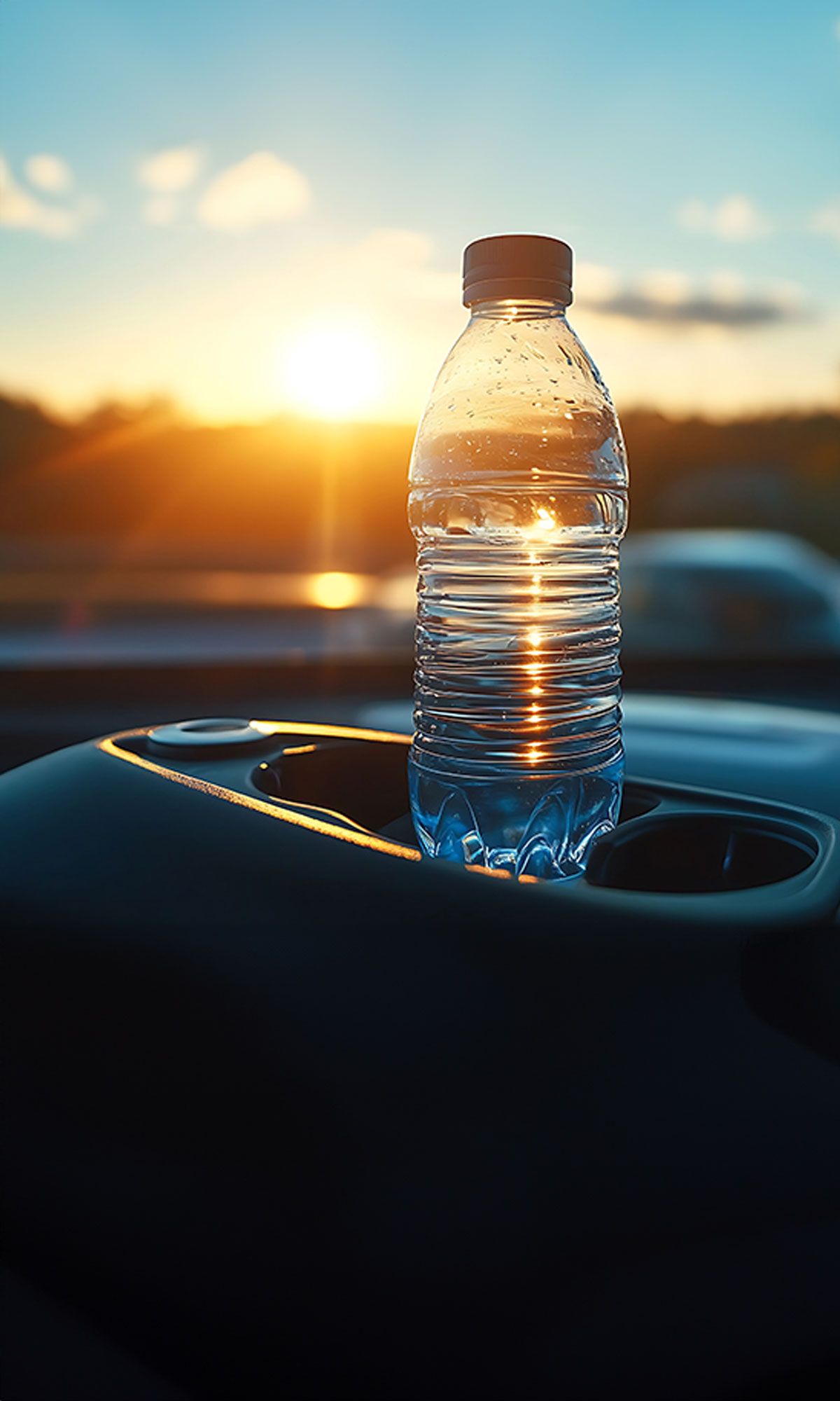 Closed vehicles can turn into ovens. When plastic bottles are exposed to extreme temperatures, the heat stress causes toxins to seep into the water—even without visible damage.