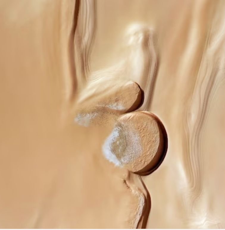 Europe's Mars Express spacecraft recently revealed a captivating sight on Mars, capturing the collision of massive sand dunes with layers of dusty ice at the planet's north pole—a phenomenon unseen before.