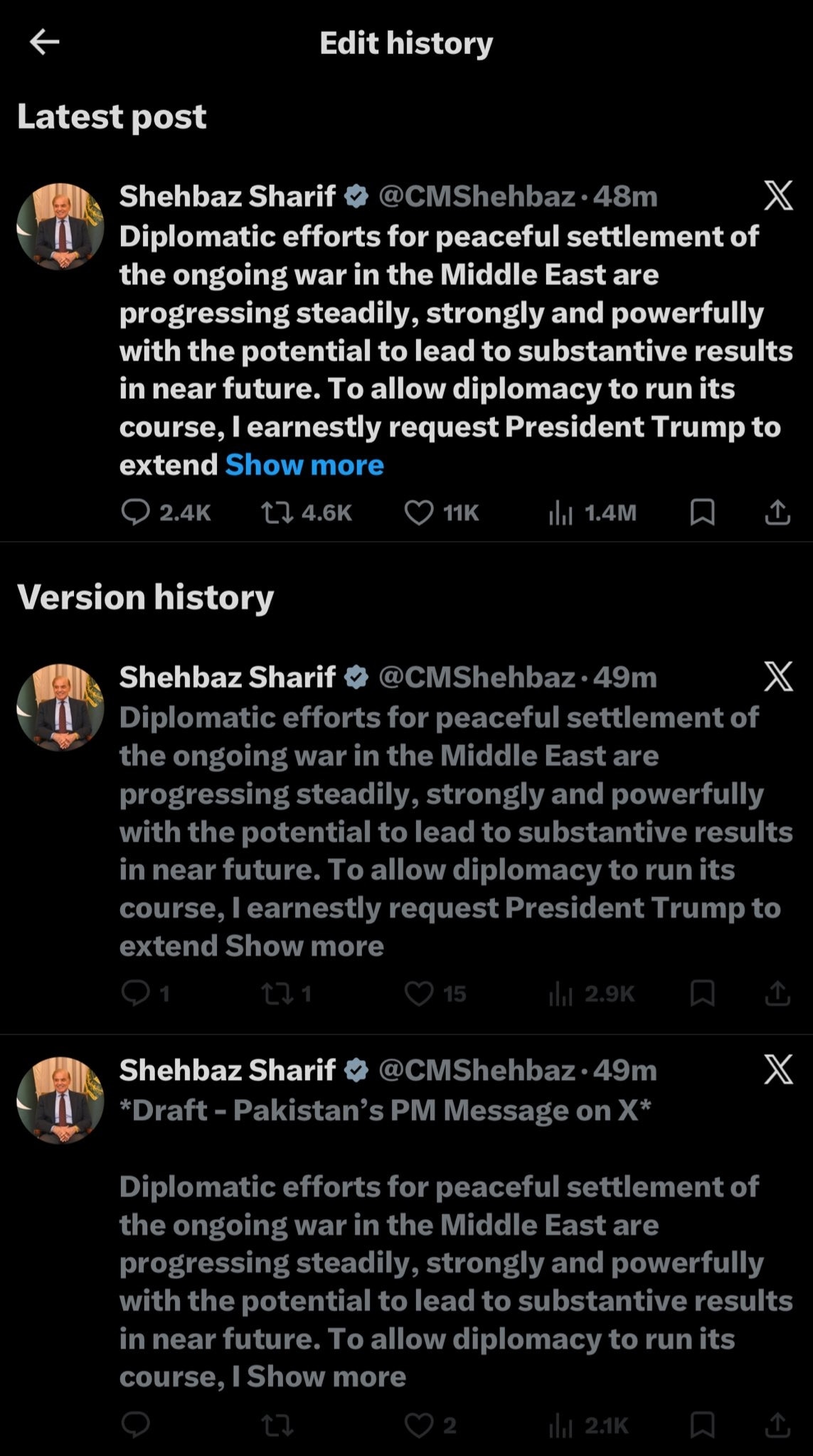 "It's honestly unbelievable - Shehbaz Sharif had a rare chance to present himself as a global peacemaker, but in the rush, he ended up leaving the 'draft' tag in place. That just turned the whole thing into an embarrassing blunder instead of a serious moment. Absolute comedy (sic)."