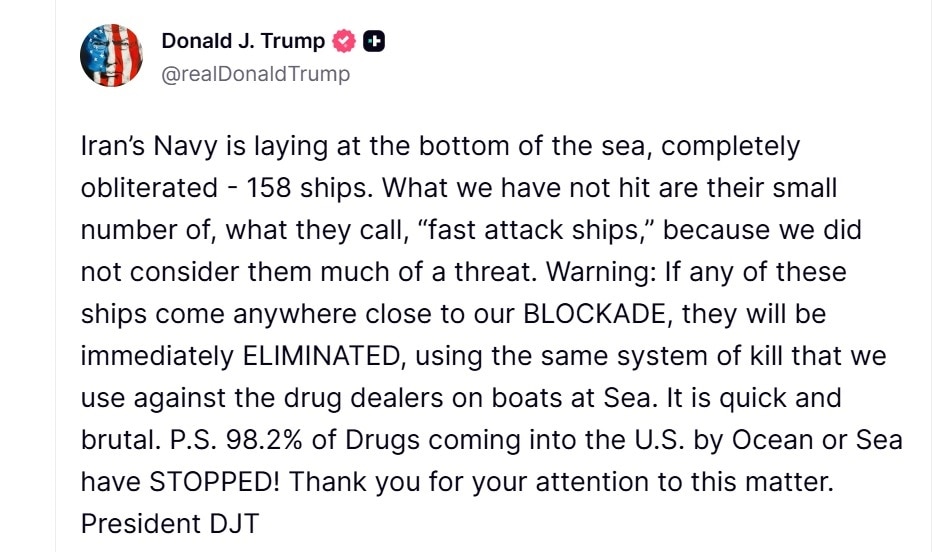In a post on Truth Social, Trump claimed that Iran's naval capabilities had already been severely degraded.