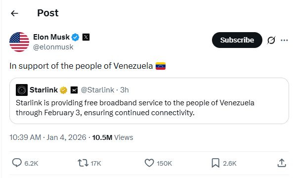 In a post on X, Musk wrote, “In support of the people of Venezuela,” while reposting a message from Starlink outlining the initiative.