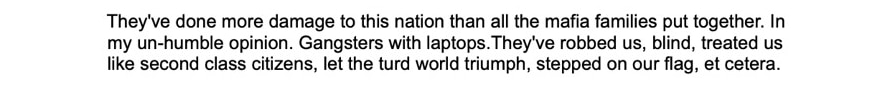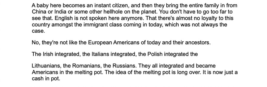 “A baby here becomes an instant citizen, and then they bring the entire family in from China or India or some other hellhole on the planet. You don't have to go too far to see that. English is not spoken here anymore. That there's almost no loyalty to this country amongst the immigrant class coming in today, which was not always the case,” the letter stated.