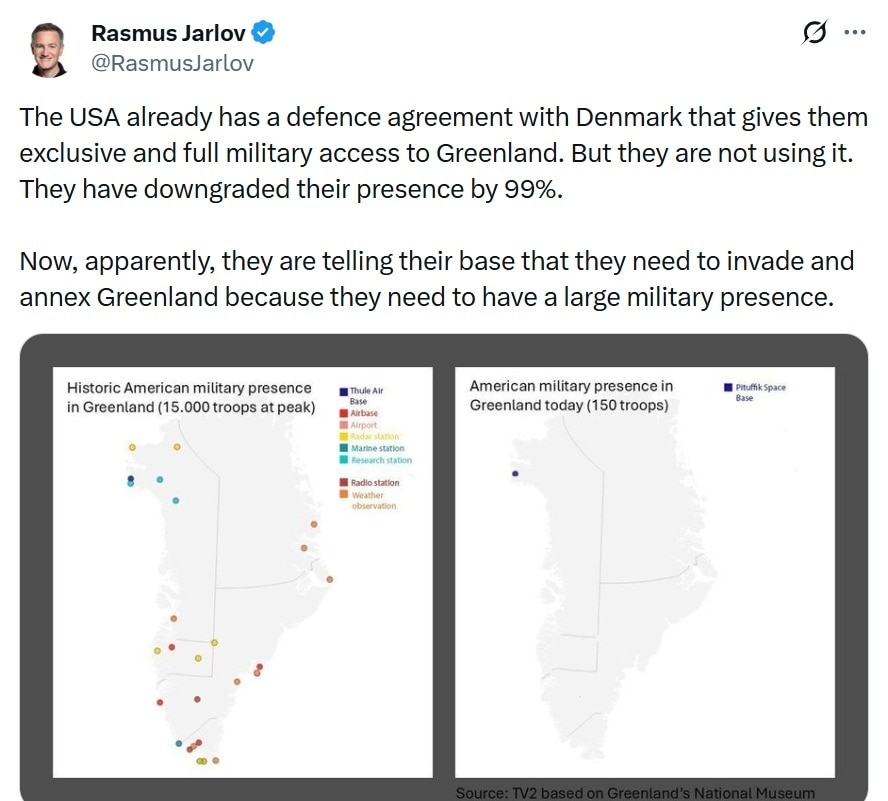 According to the MP, the US has downgraded its presence by 99%. "Now, apparently, they are telling their base that they need to invade and annex Greenland because they need to have a large military presence."