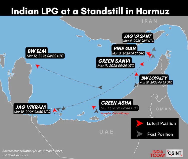 According to India Today's Open Source Intelligence Team (OSINT), 6 tankers carrying critical LPG supplies are stranded in the Strait of Hormuz. These are Jag Vasant, BW Elm, BW Loyalty, Pine Gas, Green Sanvi, Jag Vikram and Green Asha. All of these are positioned west of the Gulf, apart from Shivalik and Nanda Devi.