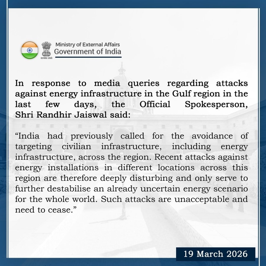 The Ministry of External Affairs (MEA) has expressed deep concern over the recent attacks on energy installations across West Asia, calling them “deeply disturbing.” The MEA warned that such incidents would further destabilise an already uncertain global energy scenario. Emphasising its strong stance, the ministry said that these attacks are unacceptable and must cease immediately.