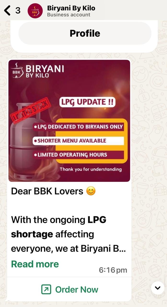 Popular biryani maker Biryani By Kilo said in a message to customers that it is tweaking its store timings to utilise more heat towards preparing its biryani. They also said that they simplified the menu to save LPG primarily for biryani cooking. In its message, Biryani By Kilo added that they are switching to backup methods for sides and other items.