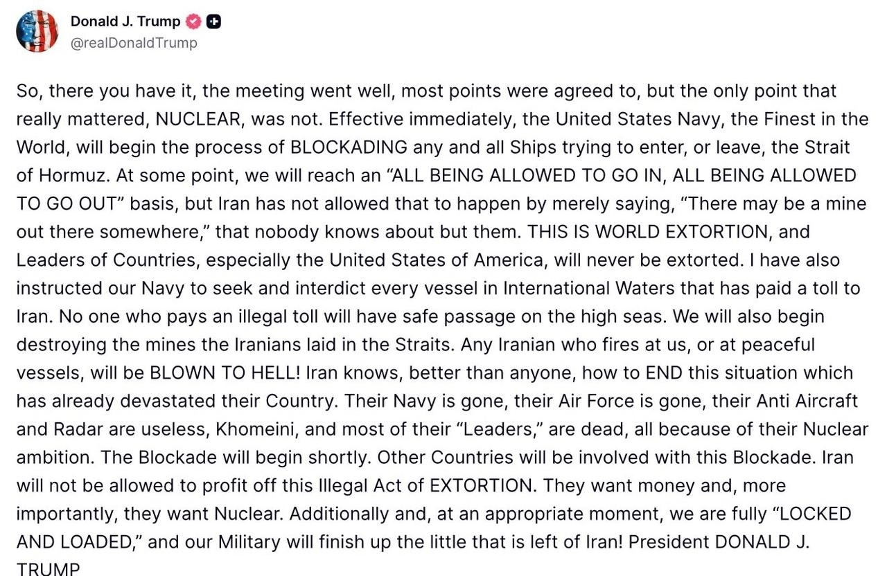 The remarks come alongside his announcement of a broader US naval response, including a potential blockade of the Strait of Hormuz and operations to locate and destroy suspected sea mines. Trump said he had directed the United States Navy to interdict vessels linked to such payments and ensure the free flow of maritime traffic.