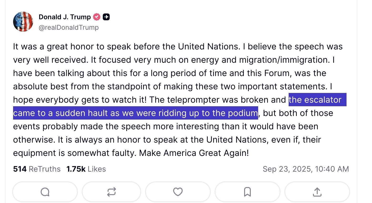 In addition to the day’s technical issues, Trump recalled his earlier interactions with the UN, referencing his failed attempt to renovate the UN headquarters in the 2010s. He stated: “They still haven’t finished the job,” he said, returning to the broken escalator. Trump’s comments revisited his longstanding contentions about the UN’s project management and decision-making, notably citing the choice of terrazzo floors over the marble he had recommended. This commentary fits into Trump’s pattern of using anecdotal evidence to critique larger organisational practices.