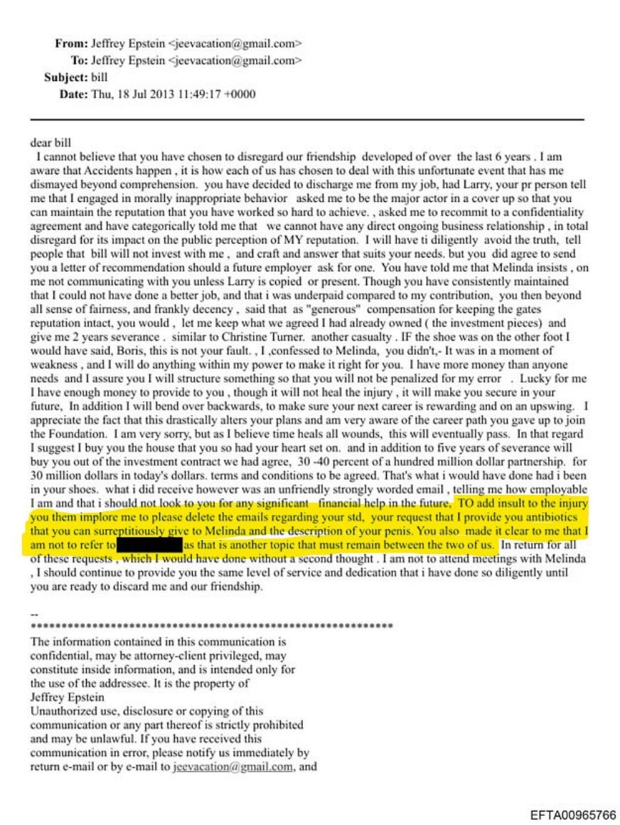 According to the documents, the emails accuse Gates of sleeping with "Russian girls," contracting a sexually transmitted infection, and seeking antibiotics to be given "surreptitiously" to his then-wife, Melinda Gates. Epstein also claimed that Gates pressured him to delete emails linked to these allegations.