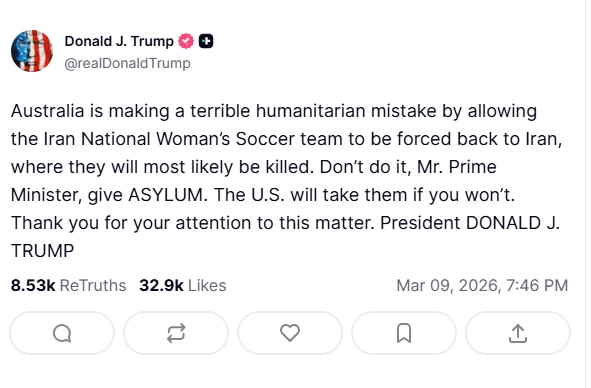 “Australia is making a terrible humanitarian mistake by allowing the Iran National Woman’s Soccer team to be forced back to Iran, where they will most likely be killed. Don’t do it, Mr. Prime Minister, give ASYLUM. The U.S. will take them if you won’t. Thank you for your attention to this matter. President DONALD J. TRUMP.”
