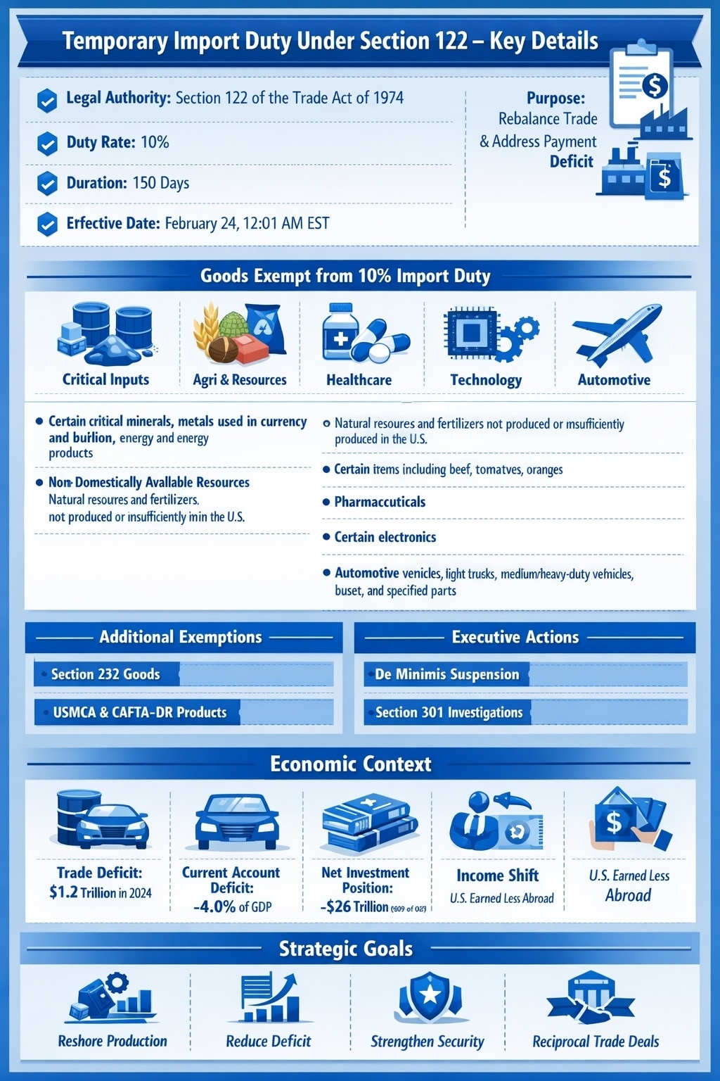 While the 10% duty applies broadly to imported articles, several categories are exempt to prevent disruption to critical sectors or supply chains. Exclusions include certain critical minerals, metals used in currency and bullion, energy and energy products, natural resources and fertilizers not sufficiently produced domestically, and selected agricultural products such as beef, tomatoes, and oranges.